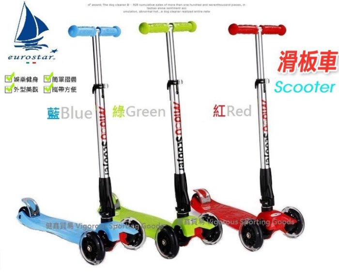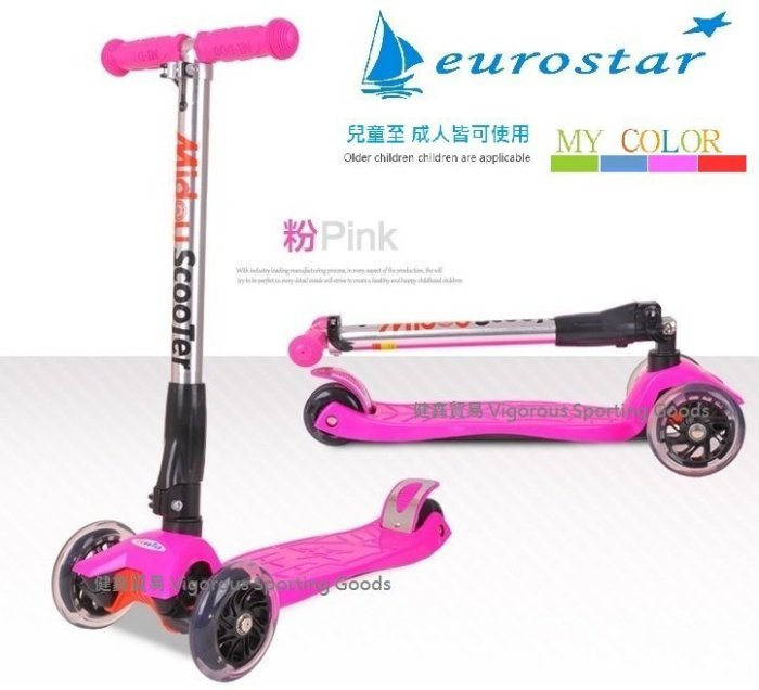 【eurostar歐洲之星】四輪滑板車為前後‘双輪’設計,後面兩個輪併在一起,特别有轉向、剎車裝置,運用重力來控制前進的方向,手把向右傾斜滑輪就向右轉,反之則向左轉。腳踏後刹蓋,滑輪就即刻停止活動、轉彎,刹車掌握輕鬆自如。色彩鲜艷奪目,流線型設計,更漂亮別緻. 可以隨意調節高度,調節長度範圍為 58 公分 - 90公分, 適合兒童及成人使用。人體工設計手把套,手感更舒服, 可方便的折疊,易於攜帶